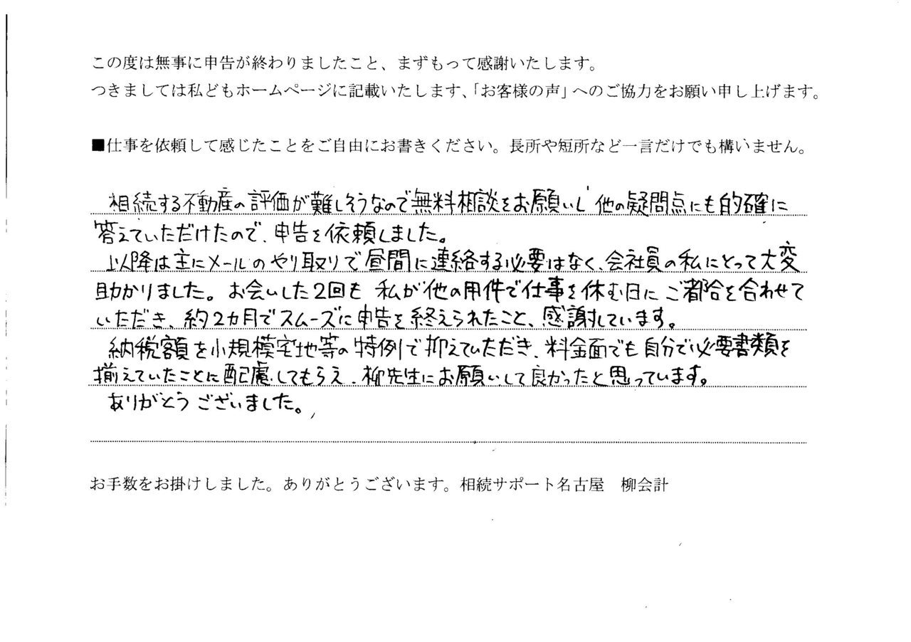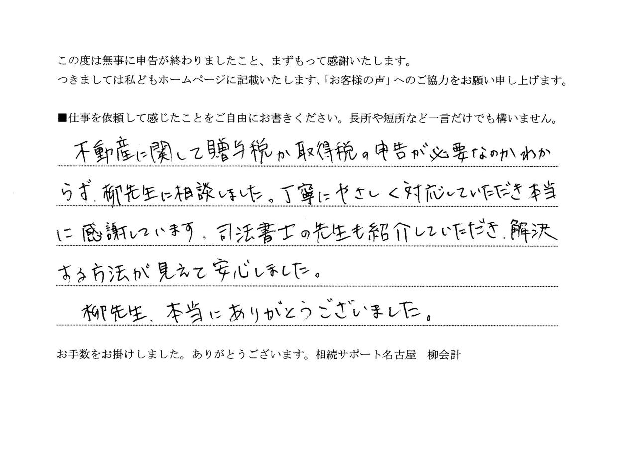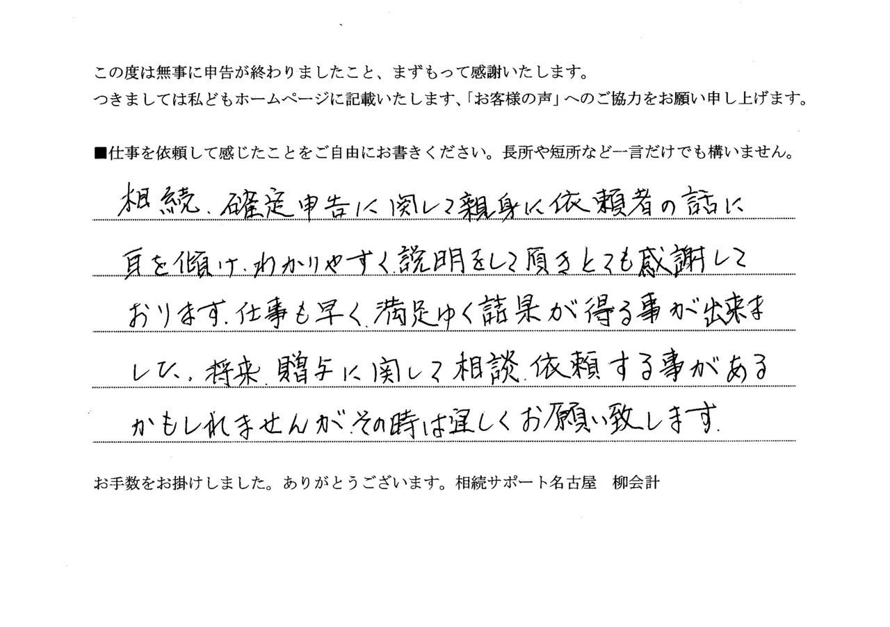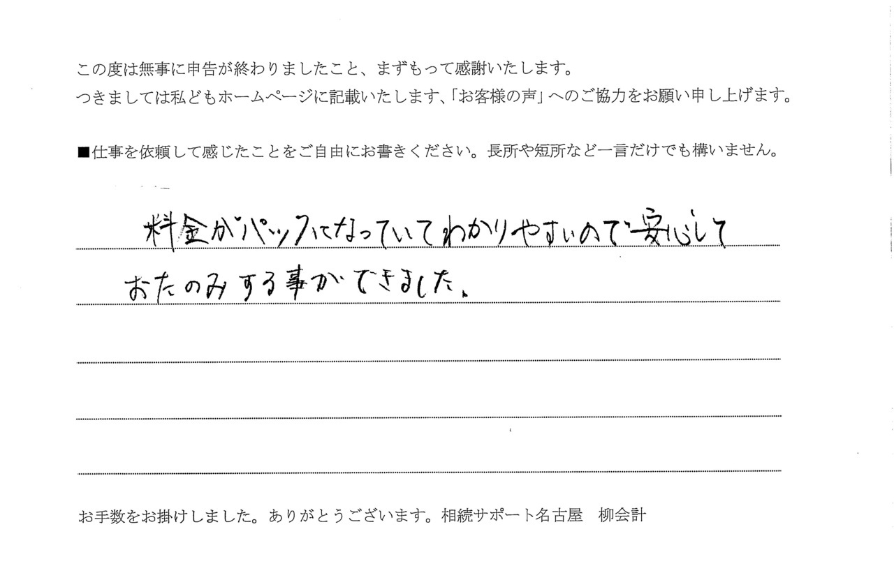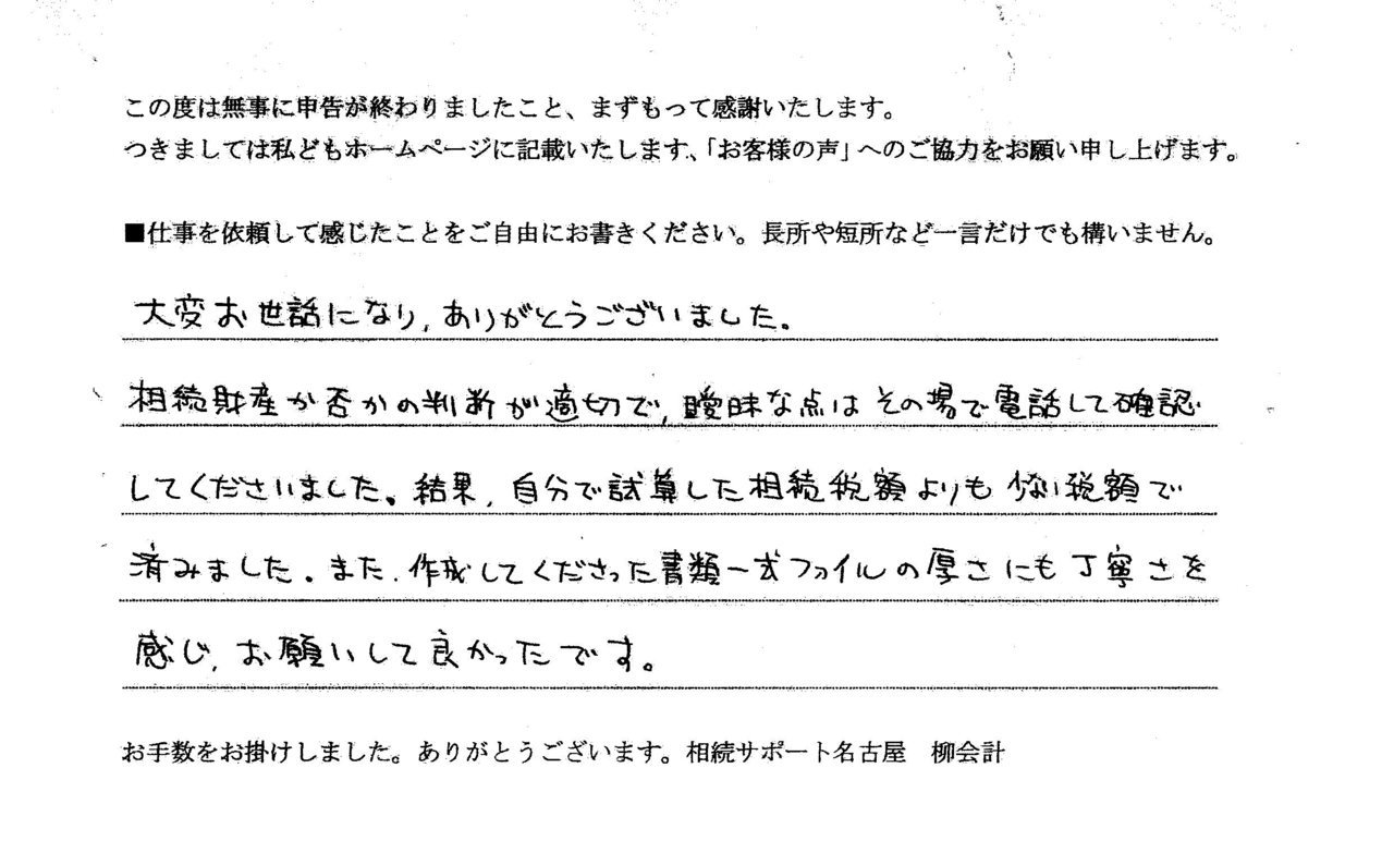 相続税で柳会計さんを利用した知人から勧められて。ホームページで大まかな印象は分かっていた事と会社からも近かった事です。話を丁寧に聞いてくれるところが一番の決め手でした。